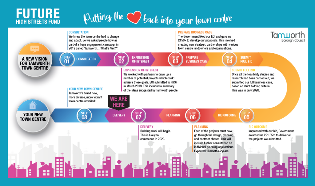 Tamworth has been awarded an incredible £21.65m from the Future High Streets Fund to transform the town centre into the busy, thriving heart of the community.
